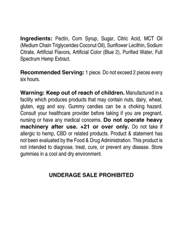 WARNING: Keep out of reach of children. Gummy candies can be a choking hazard. Consult your healthcare provider before taking if you are pregnant, nursing or have any medical concerns. Do not take if allergic to hemp, CBD or related products. Product & statement has not been evaluated by the Food & Drug Administration. Store gummies in a cool and dry environment. This product is not intended to diagnose, treat, cure, or prevent any disease. Underage Sale Prohibited.